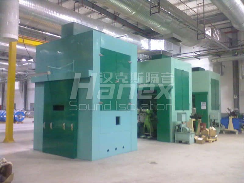 案例簡(jiǎn)介:廠區(qū)車間內(nèi)有三臺(tái)沖床,用于生產(chǎn)汽車零配件,單臺(tái)沖床運(yùn)作時(shí)噪聲值在96dB(A),影響較大。漢克斯隔音對(duì)三臺(tái)沖床分別增設(shè)了隔聲罩后,在隔聲罩1米處量的噪聲值為76dB(A)(單臺(tái))。隔聲罩內(nèi)設(shè)有通風(fēng)散熱等性能,不影響設(shè)備本身使用。