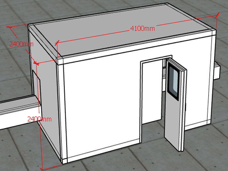 1.1.1根據(jù)我司技術(shù)人員現(xiàn)場測量,流水線處環(huán)境噪聲為75-78dB(A),設計隔音房尺寸為:2400mm*4100mm*2400mm。隔音房板厚120mm,預計隔音房安裝完成后,內(nèi)部噪聲值降至40dB(A)。