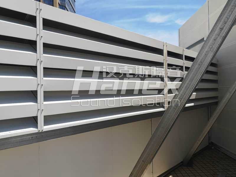 2)安裝進(jìn)風(fēng)消聲百葉:為保證3組空調(diào)機(jī)組進(jìn)風(fēng)量需求及罩內(nèi)設(shè)備通風(fēng)散熱,整體隔聲罩四周設(shè)計(jì)安裝進(jìn)風(fēng)消聲百葉;