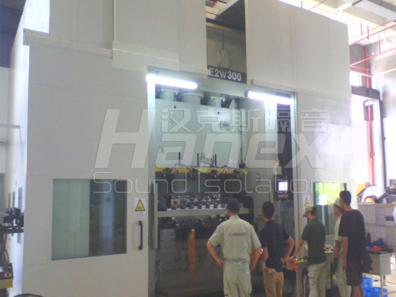對400t沖床加裝漢克斯隔音罩(見效果圖)方案進(jìn)行降噪。隔音罩的吸隔聲板采用100mm厚的復(fù)合鋼板,復(fù)合結(jié)構(gòu)由加強筋、隔聲層、阻尼層、吸聲層組成。隔聲罩設(shè)計隔聲量≥30dB(A),因進(jìn)、出料口開口,實際隔聲量≥25 dB(A)。