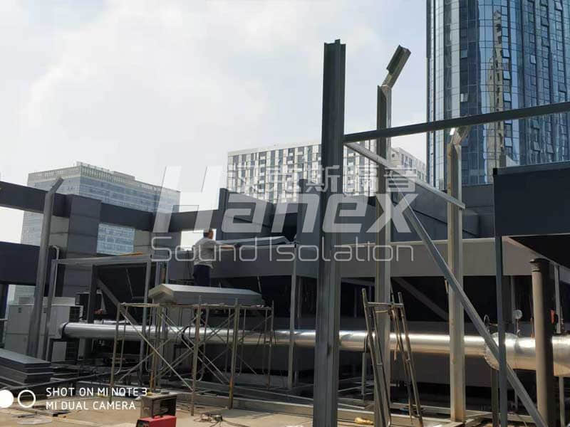3、根據(jù)現(xiàn)場(chǎng)實(shí)際情況,空調(diào)機(jī)組底部的壓縮機(jī)周?chē)鸁o(wú)阻擋,我司技術(shù)人員發(fā)現(xiàn)壓縮機(jī)工作運(yùn)行時(shí)所產(chǎn)生的噪聲往外擴(kuò)散,影響其周邊環(huán)境。因此,我司技術(shù)人員結(jié)合以往同類(lèi)項(xiàng)目案例經(jīng)驗(yàn),采用隔音板對(duì)空調(diào)機(jī)組底部壓縮機(jī)四周進(jìn)行圍擋,控制其工作產(chǎn)生的噪聲往外擴(kuò)散。同時(shí)從空調(diào)機(jī)組頂部做500mm隔聲掛板,防止壓縮機(jī)產(chǎn)生的噪聲從頂部溢出擴(kuò)散到周?chē)h(huán)境。