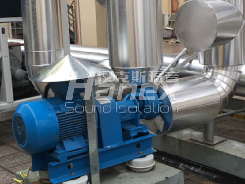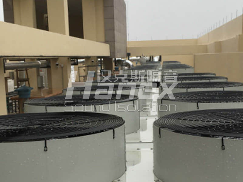 海寧四院住院樓平臺安裝有一組中央空調(diào)外機,空調(diào)正常開啟狀態(tài)下層辦公區(qū)及病房區(qū)測量噪聲值達56分貝。漢克斯隔音設(shè)計1.空調(diào)機組減振(空調(diào)減震器),2.進水管道減振,達到空調(diào)開啟時下層病房內(nèi)夜間測量值低于40分貝。